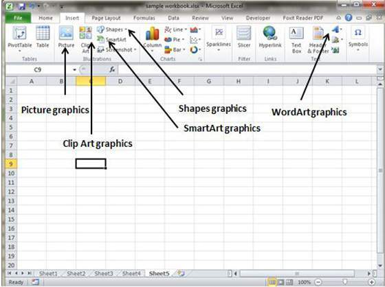 In MS Excel, user can insert various kind of graphic objects like Text Box, Shapes gallery, WordArt and SmartArt, which is available in the Insert Tab.