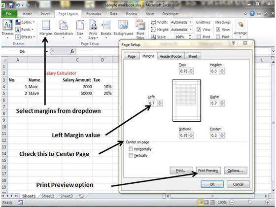 MS Excel has default setting that aligns the printed page right at the top and left margins. Users can change the alignment to be centered either vertically or horizontally by clicking on the appropriate option in the Center on Page section in the Margins Tab as it can be seen in above image.