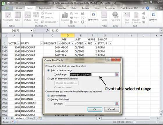Assume you have a huge data of voters and you wish to see a summarized data of voter information as per party. Then, go to the Insert tab and click on the PivotTable.