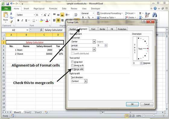 Now choose the Alignment tab from the Format cells dialogue box in order to merge the cells.