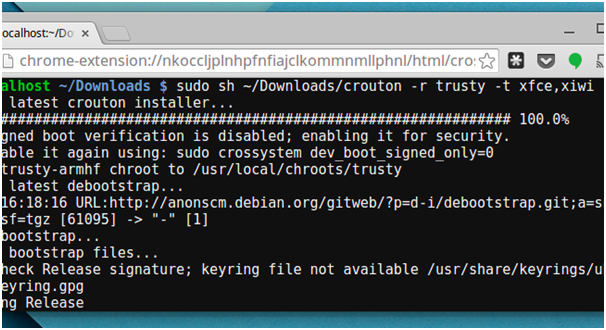 Now install the Crouton and ensure that you install ‘xiwi’ or ‘extension target of the Crouton. For installing the popular Linux OD called Ubuntu 14.04 with the Xfce desktop, run this command.