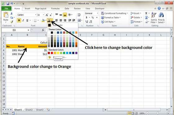 In MS Excel, the background color of cell is set as while by default. Change the background color as per your need by going to the Home tab, followed by Font group and Background color.
