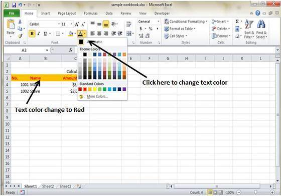 In MS Excel, text color or foreground is set as black by default. Change the foreground color as per your need by going to the Home tab, followed by Font group and Foreground color.