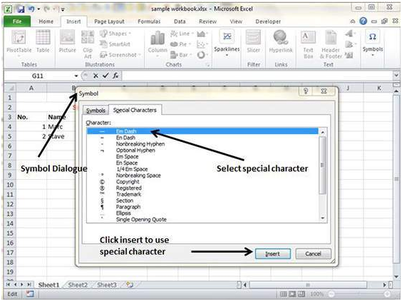 In order to use the special symbols in MS Excel, go to the Insert followed by Symbols, Special Characters. It will now show the various special characters which can be used in the worksheet.
