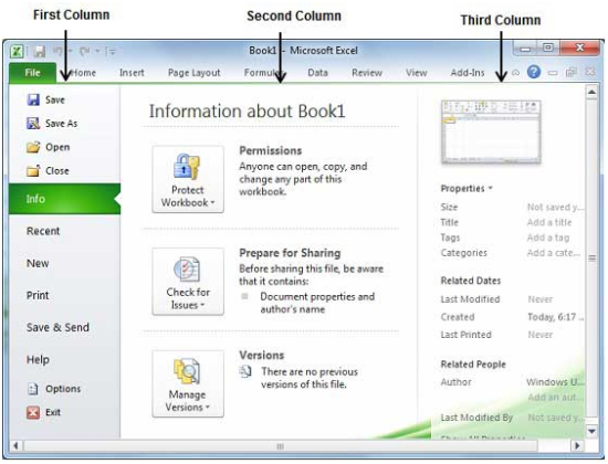 If you have an opened sheet already, then it will display a window showing various details about the opened sheet. Backstage view offers clear segregation of information in three different columns like in this image.
